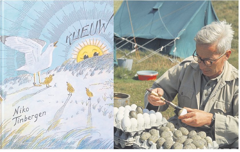Links: omslag kinderboek Klieuw. Rechts: Tinbergen verft kippeneieren op veldwerk in Meijendel. Foto rechts: Life Magazine