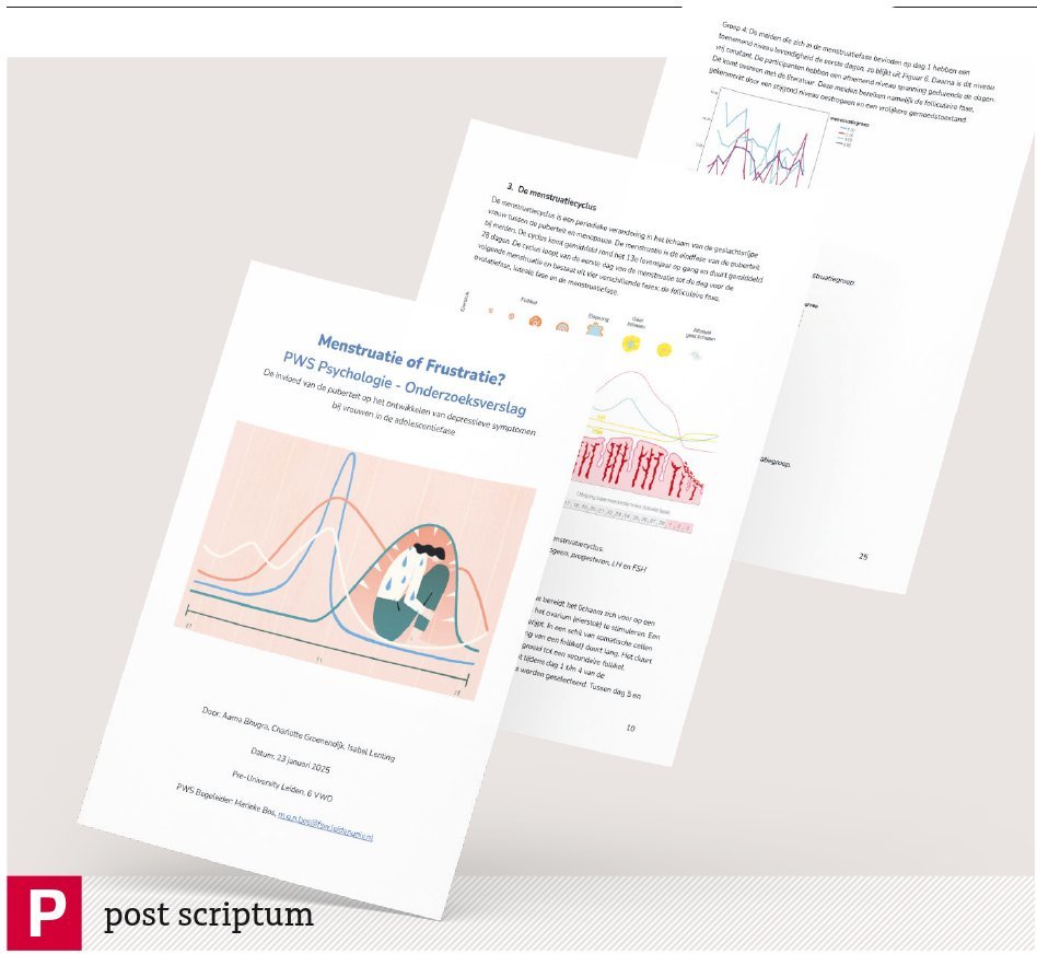 ‘De schommeling van hormonen tijdens de menstruatiecyclus kan veel invloed hebben op hoe je je voelt. We wilden onderzoek doen naar de invloed van puberteit op de ontwikkeling van depressieve klachten, en de menstruatiecyclus leek ons daar een goede focus voor’, legt vwo-scholier Charlotte Groenendijk uit. Samen met Aarna Bhugra en Isabel Lenting doet ze voor haar profielwerkstuk bij Pre-University College Leiden onderzoek naar het verband tussen depressie en hormonen bij pubers.