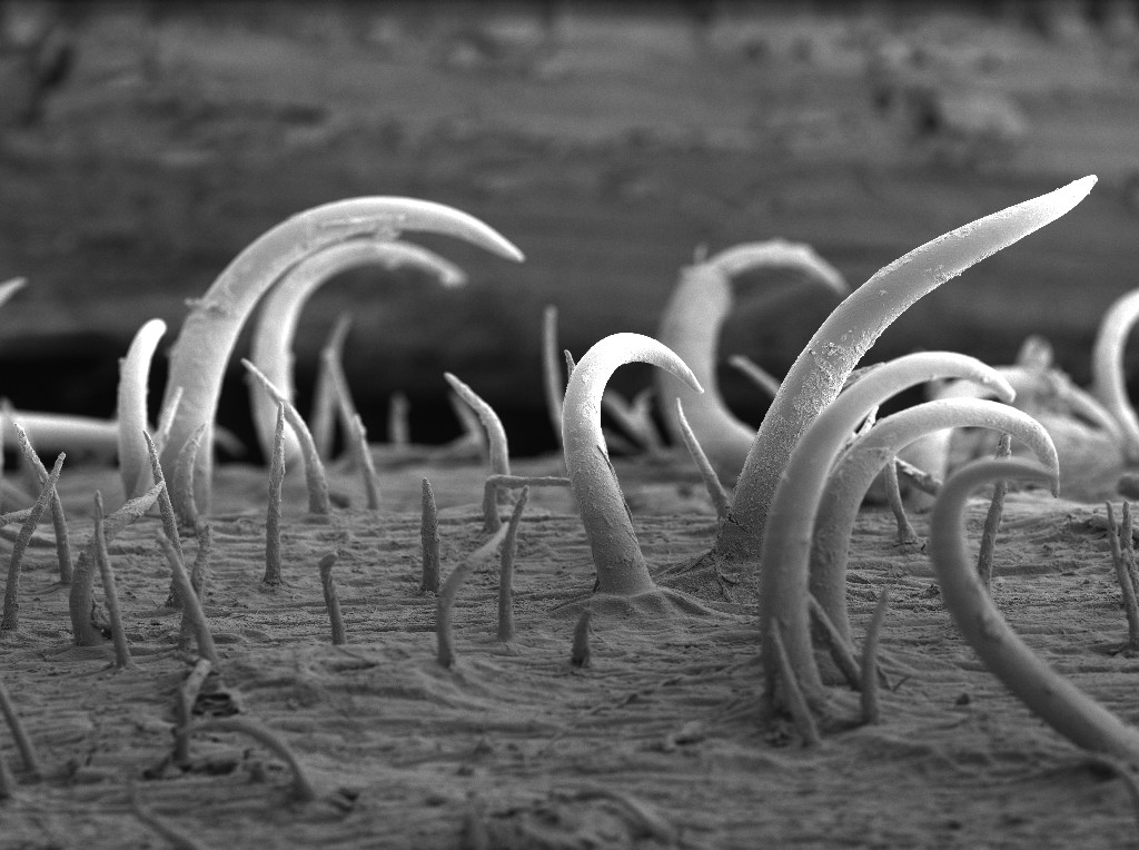 Verdedigingsmechanismen van planten kunnen leiden tot selectiedruk die nieuwe aanpassingen stimuleert bij zowel aanvallende insecten als de plant zelf. Hoewel zulke evolutionaire wapenwedlopen een bekend fenomeen zijn, spreken vrijwel alle voorbeelden enkel over chemische plantenverdediging. Onderzoekers uit Brunei en Cambridge suggereren dat ook fysiek verweer zorgt voor co-evolutie tussen plant en insect (Biology Letters, 4 juni). De studie laat zien dat de haakvormige haren op de stengels en bladstelen van de Borneose boom Macaranga trachyphylla geen gevaar vormen voor rupsen van de vlindersoort Arhopala amphimuta– die van nature op deze boomsoort voorkomt – terwijl ze veelal dodelijk zijn voor rupsen van verwante vlindersoorten die normaal andere Macaranga-soorten bewonen. Haakharen komen binnen het geslacht Macaranga uitsluitend voor op M. trachyphylla, naar verwachting als antwoord op vraat door rupsen. Ze doorboren de lijfjes en poten van drie van de vier Arhopala -soorten die het onderzoeksteam verzamelt en op verschillende delen van de boom plaatst, maar A. amphimuta komt ongeschonden uit de test.