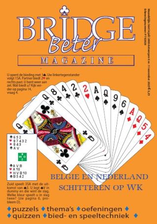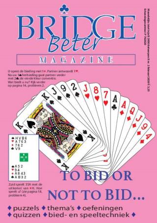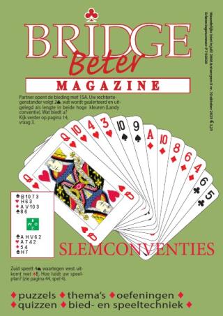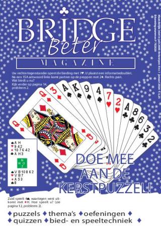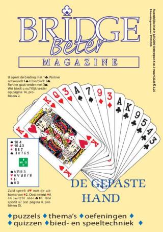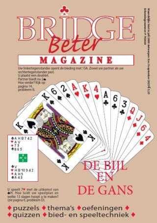 Het Bridge Beter Magazine biedt interessante onderwerpen voor bridgers van elk niveau. Een abonnement betekent maandelijks uw kennis uitbreiden en verfrissen middels stukjes theorie gevolgd door oefeningen, quizzen en puzzels. Het magazine telt 48 pagina’s onderverdeeld in een tiental rubrieken. Ondermeer de zeer populaire rubriek wedstrijdbridge, waarbij u met vier spelers een wedstrijd van acht spellen kunt spelen.
